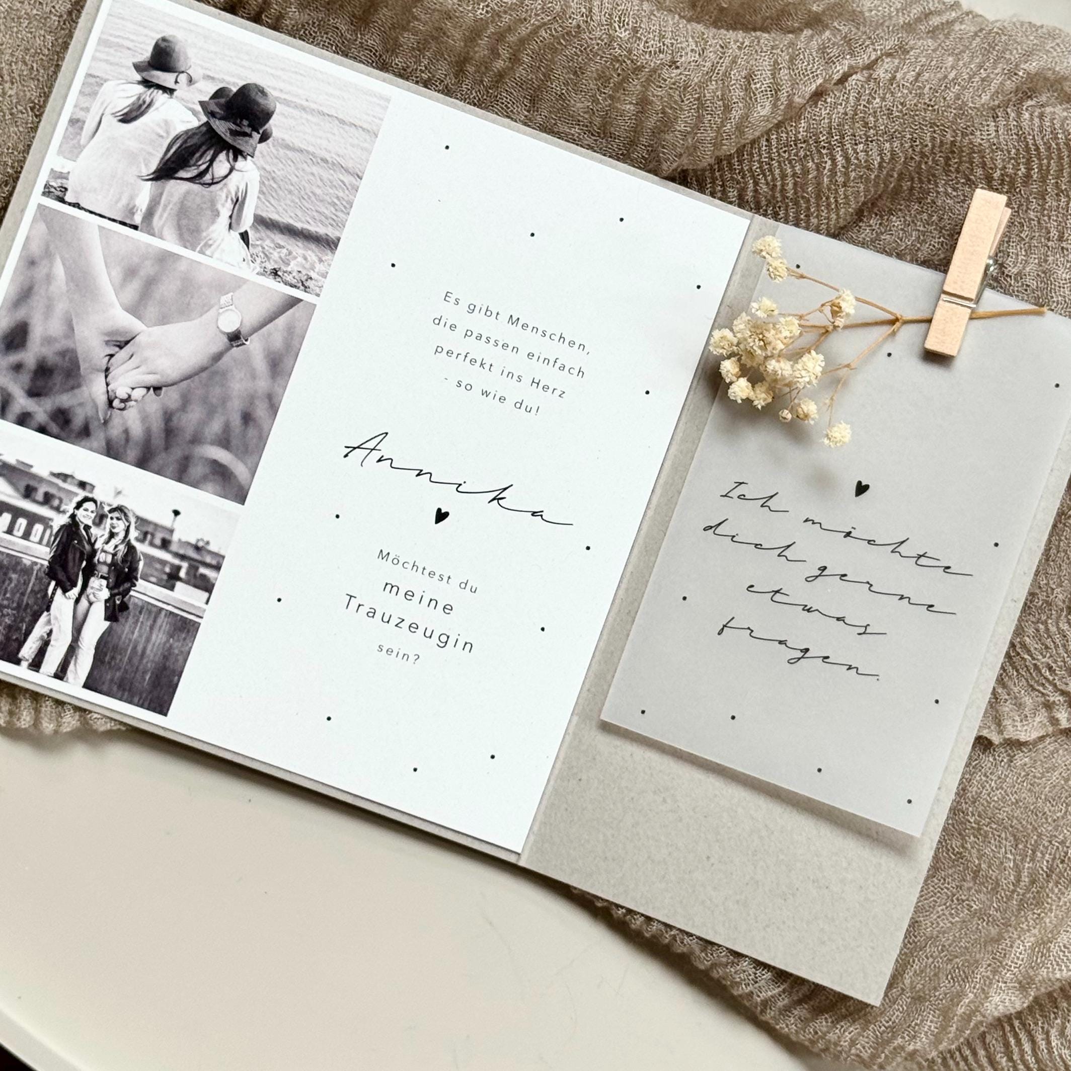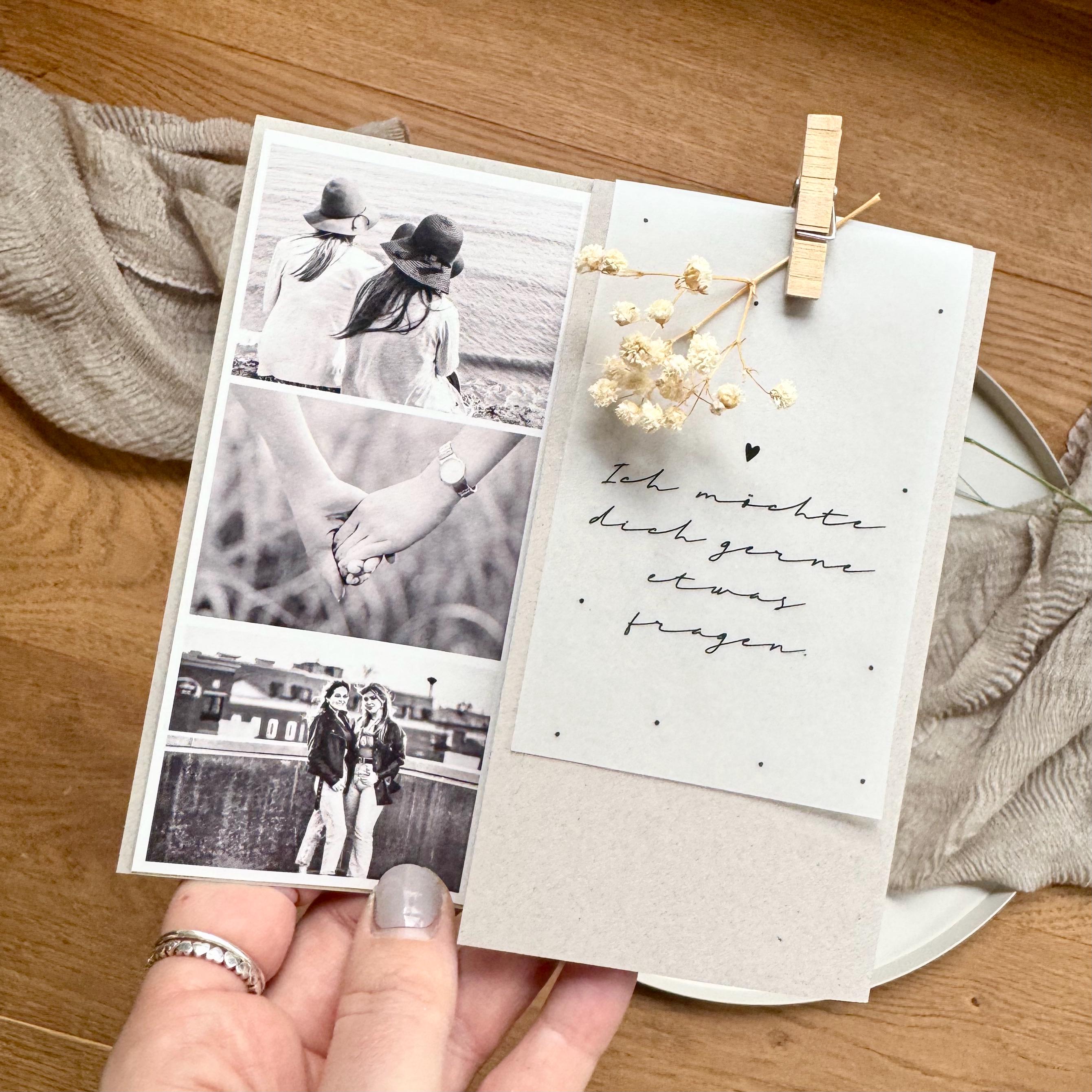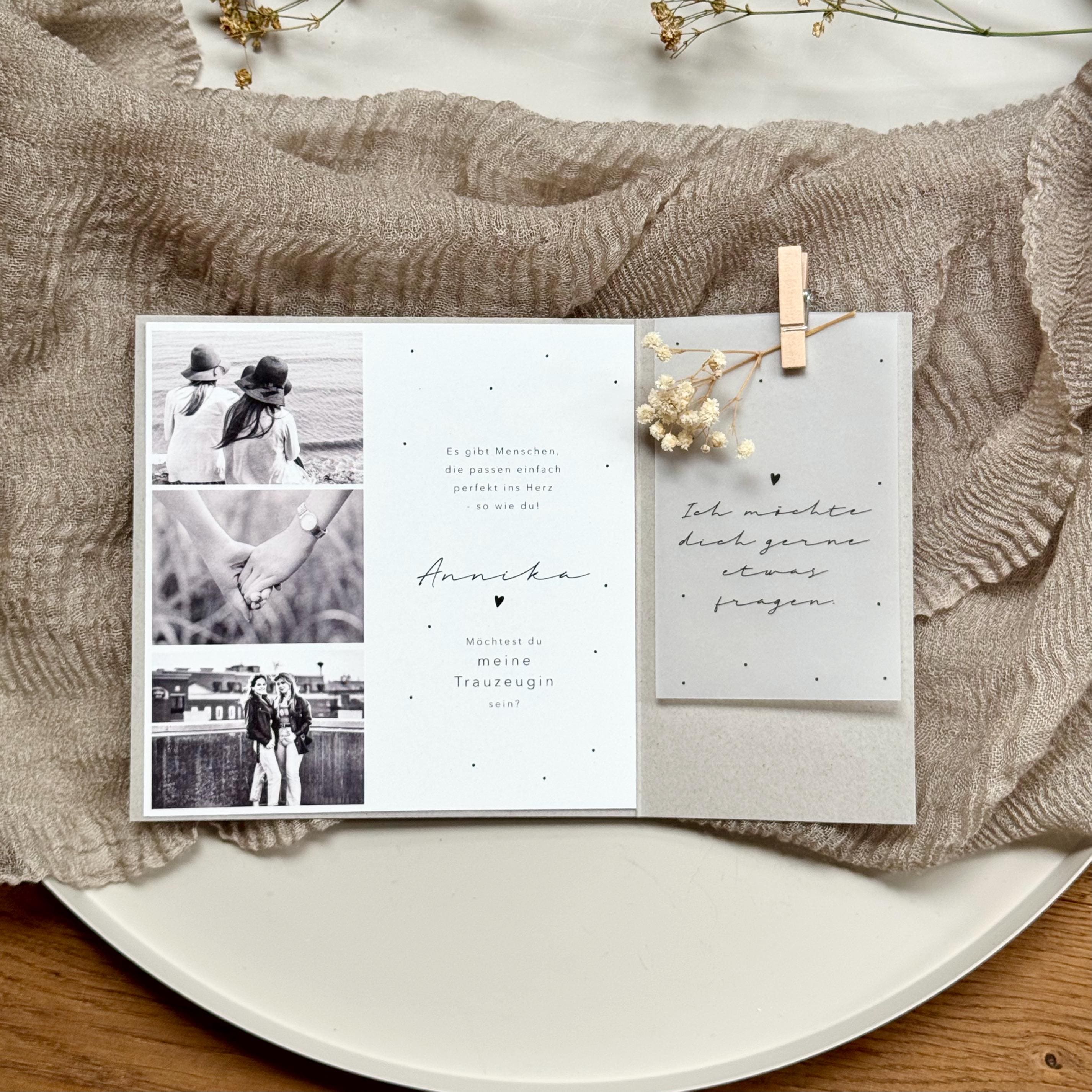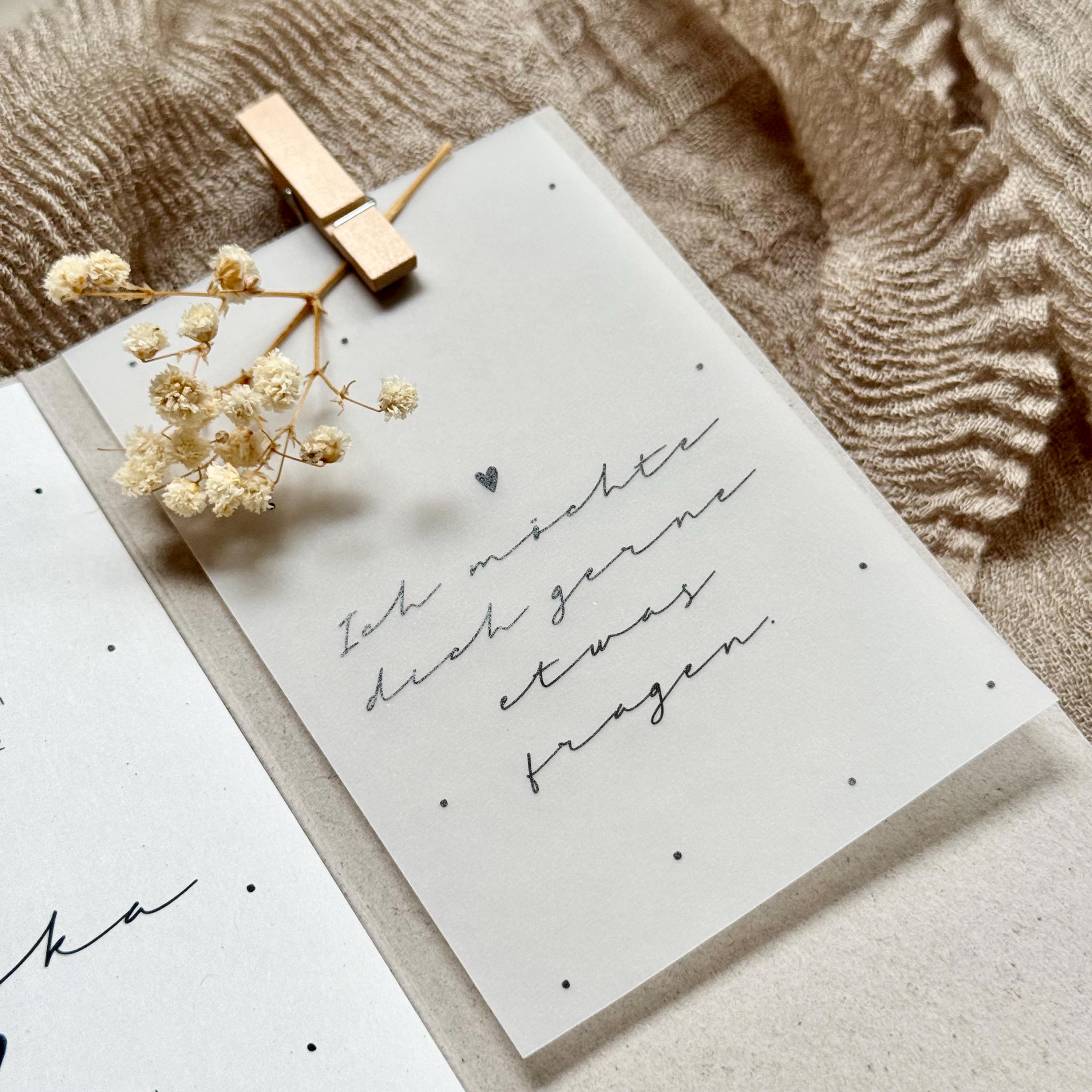 The surprise card is handmade by us – it's a folded card made from very high-quality, beautifully gray-dyed natural paper (25% of the ingredients are recycled leather) with a weight of 380 g/m², which makes this product special both to the touch and to the eye. There are some inclusions or irregularities in the paper, which give it its natural character.