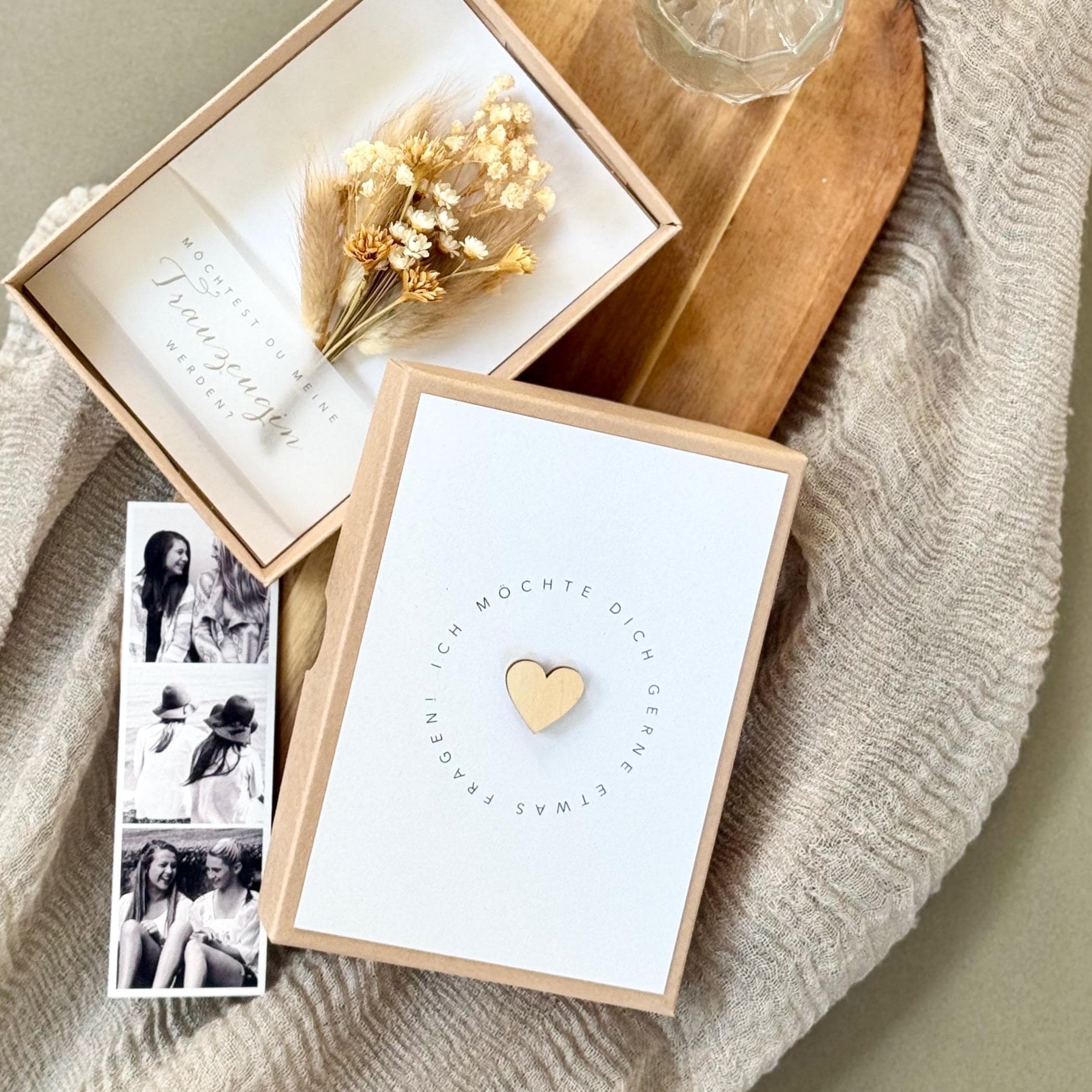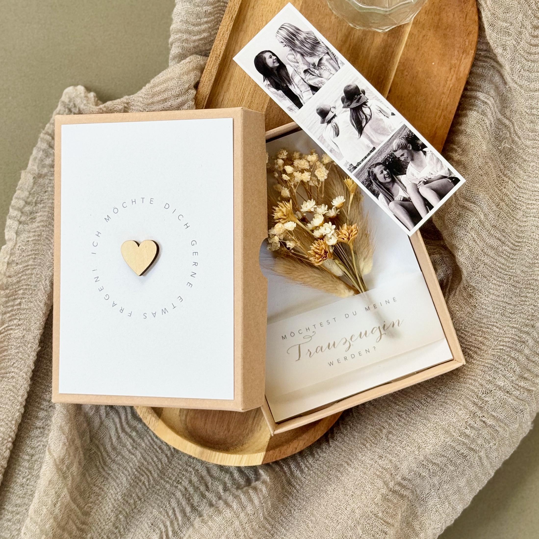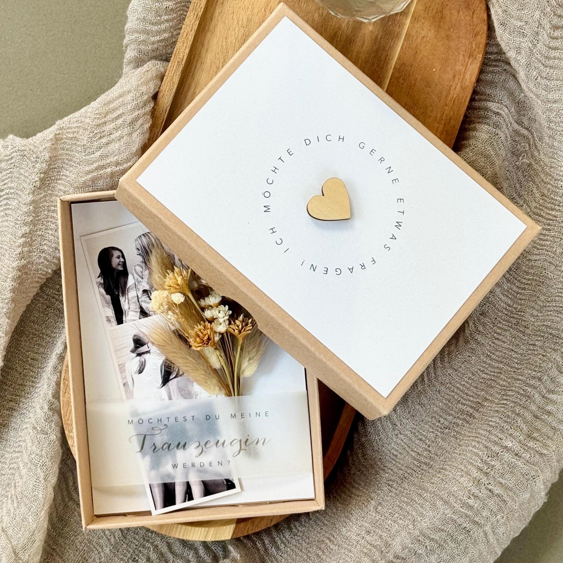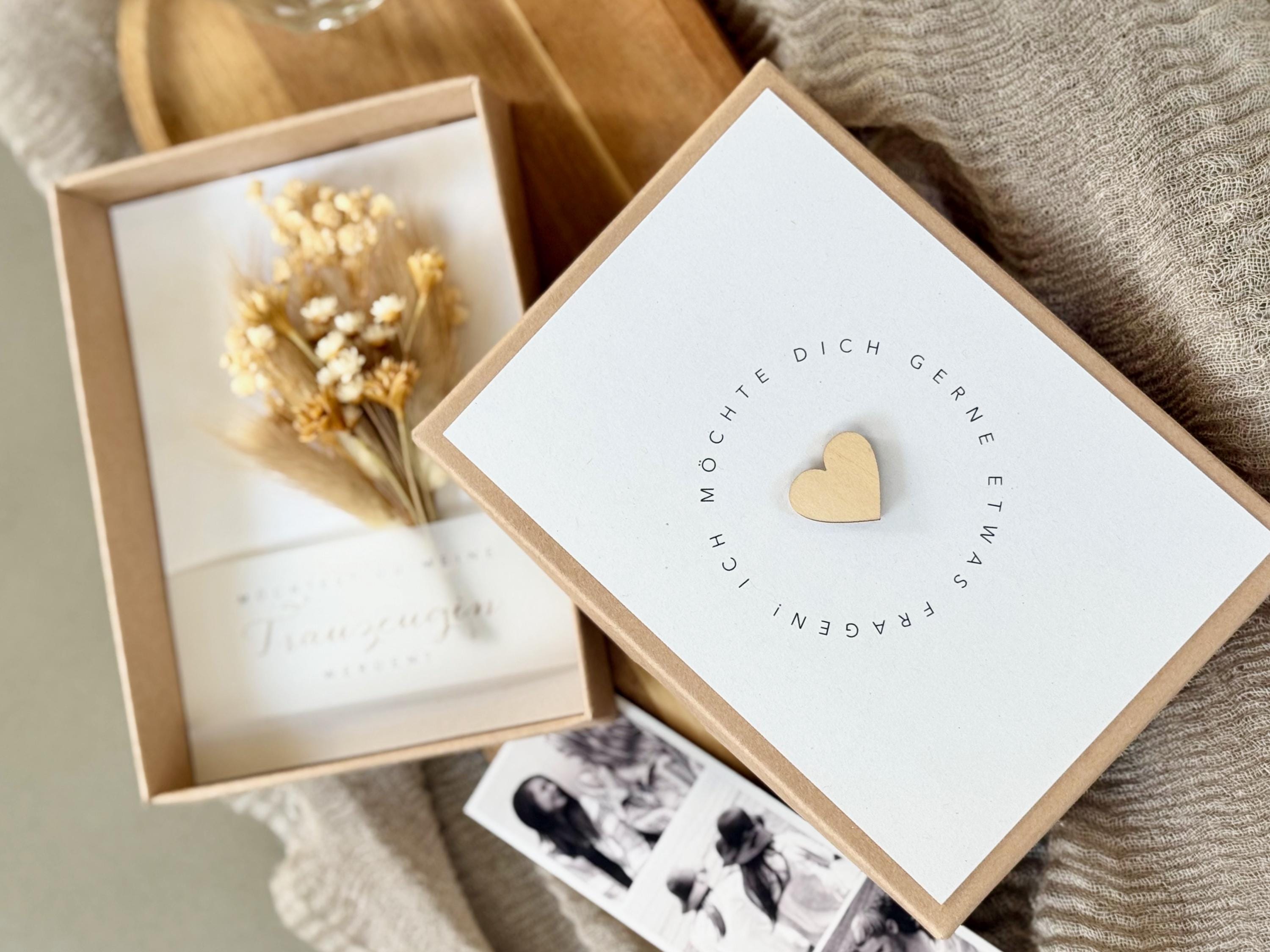 The lid of the small gift box is decorated on the outside with a card and a small wooden heart, on which the saying 'I would like to ask you something' is written.
