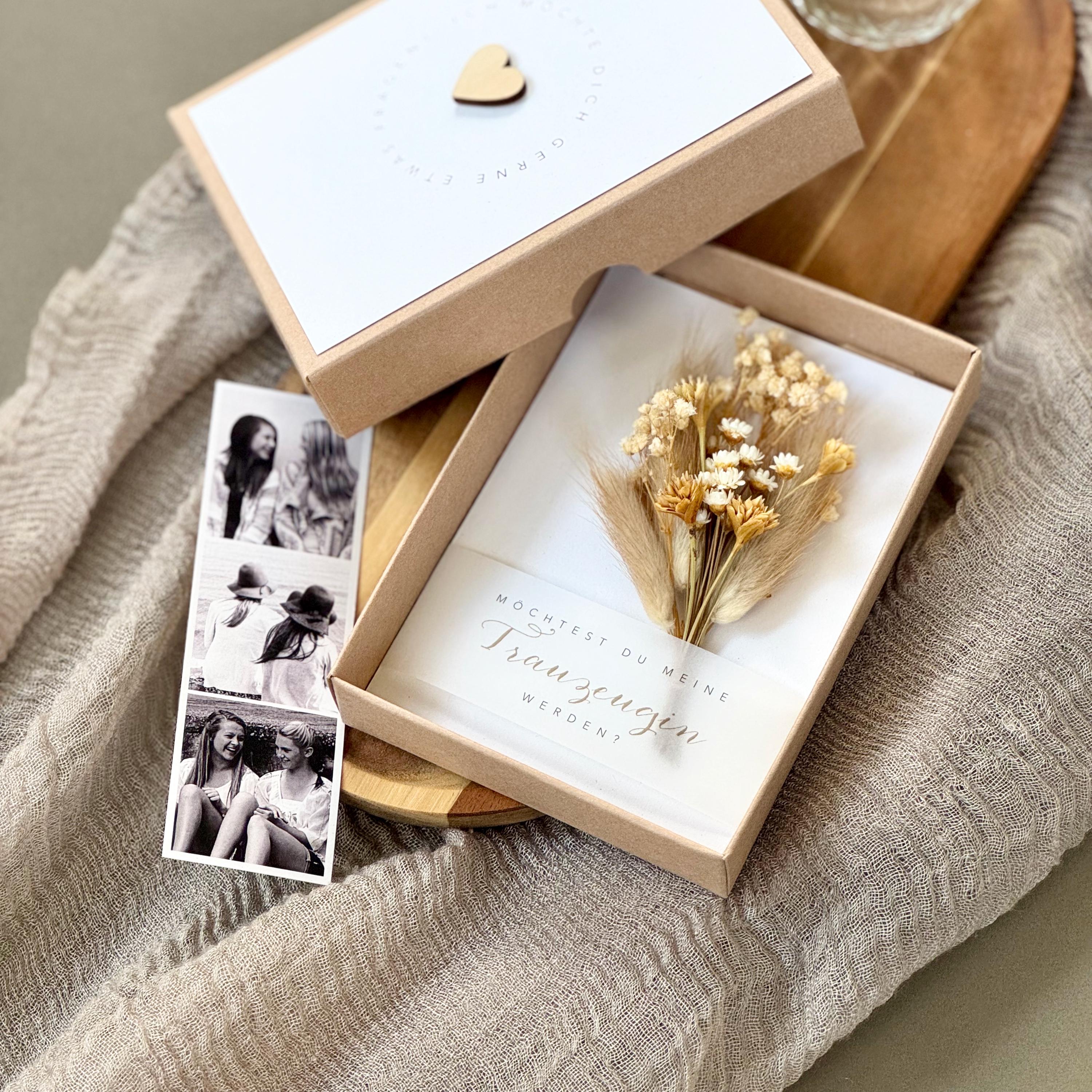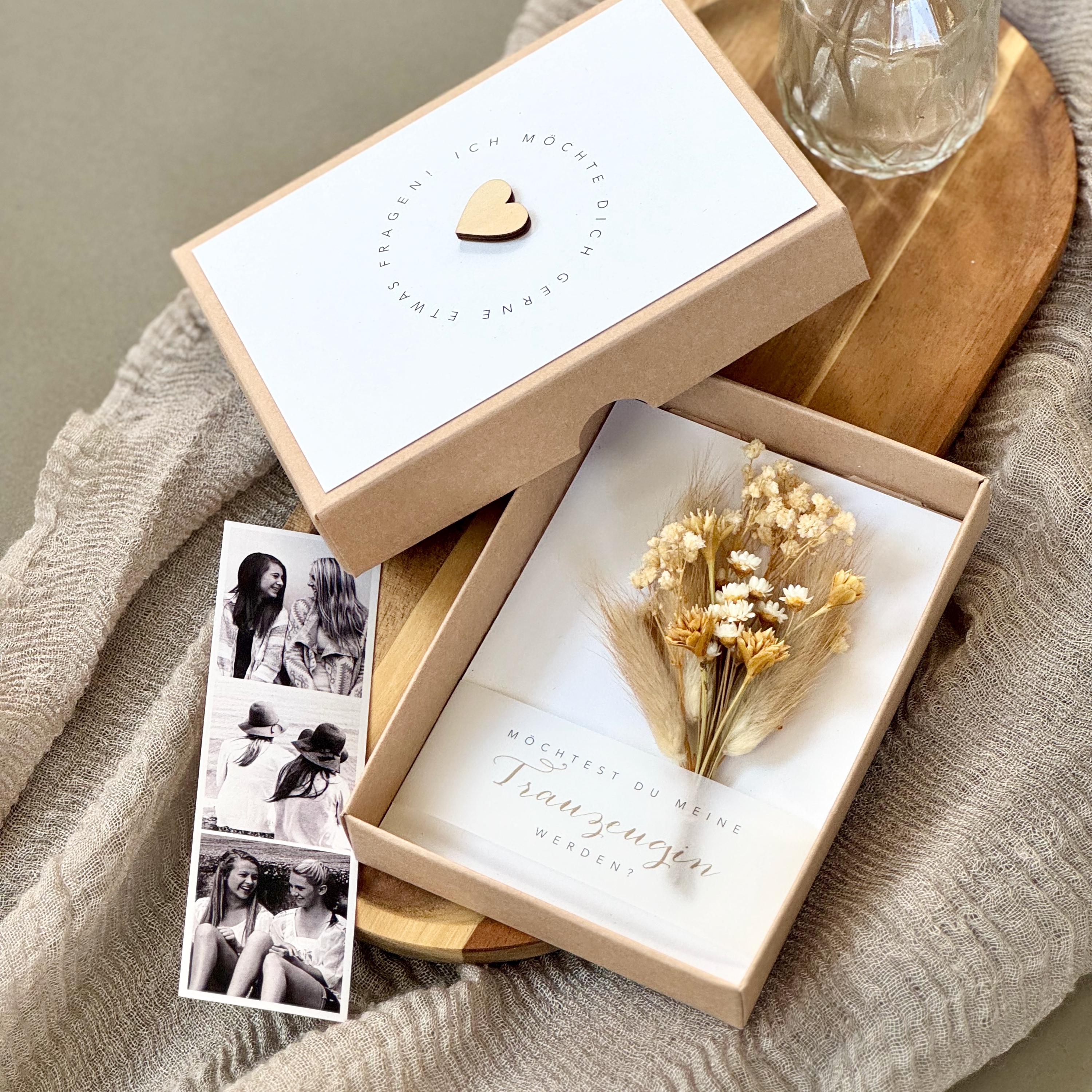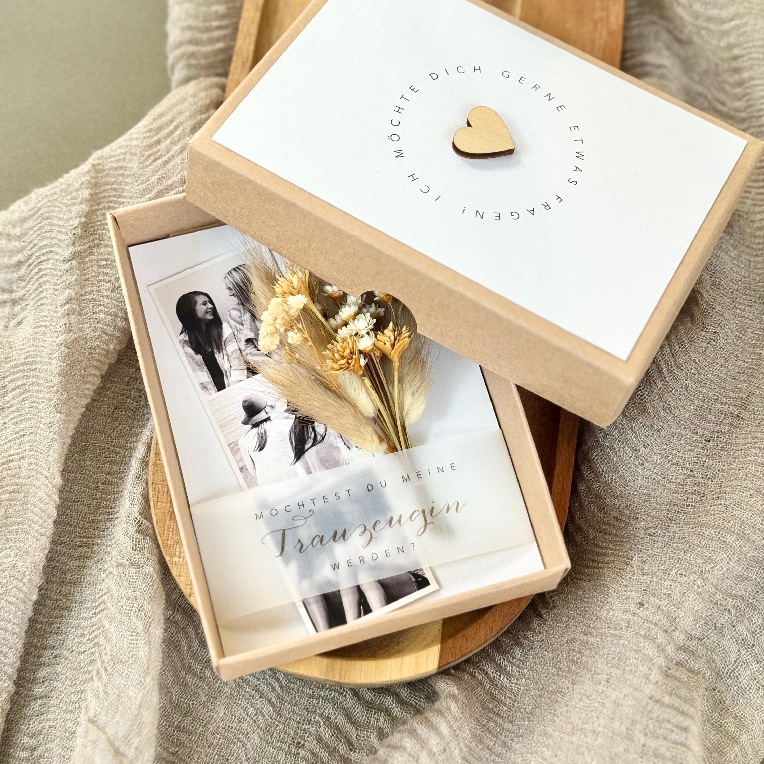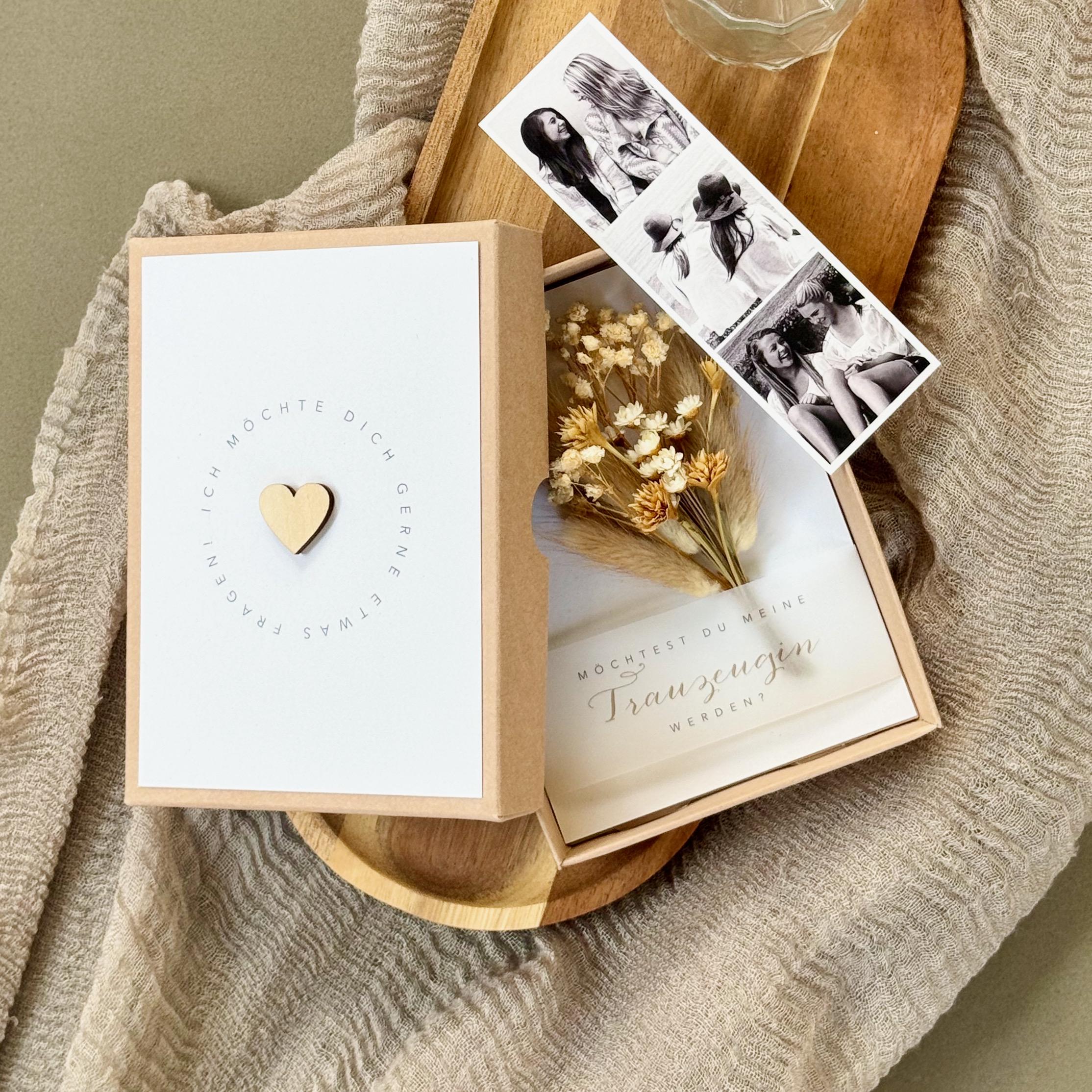 The lid of the small gift box is decorated on the outside with a card and a small wooden heart, on which the saying 'I would like to ask you something' is written.