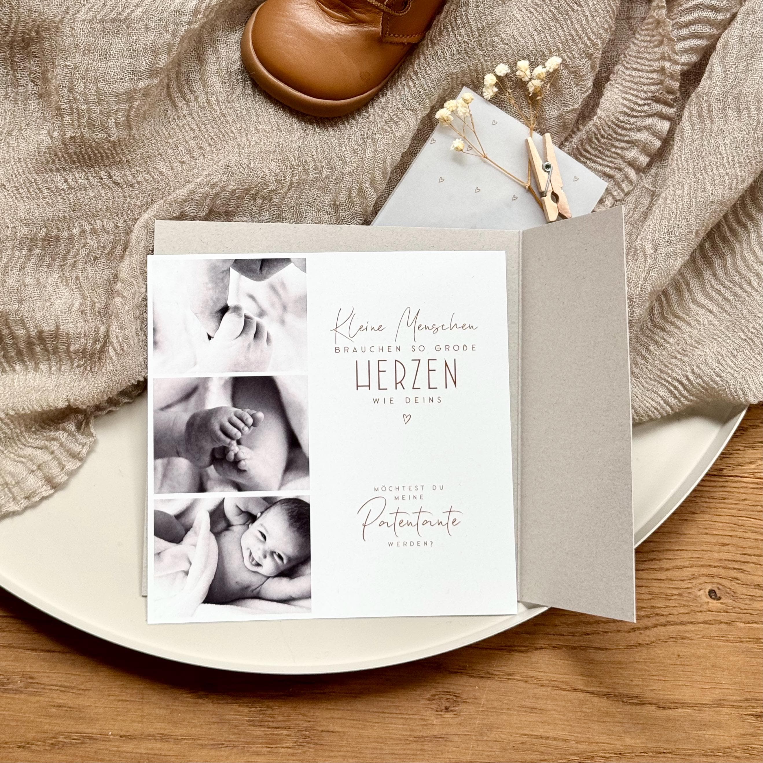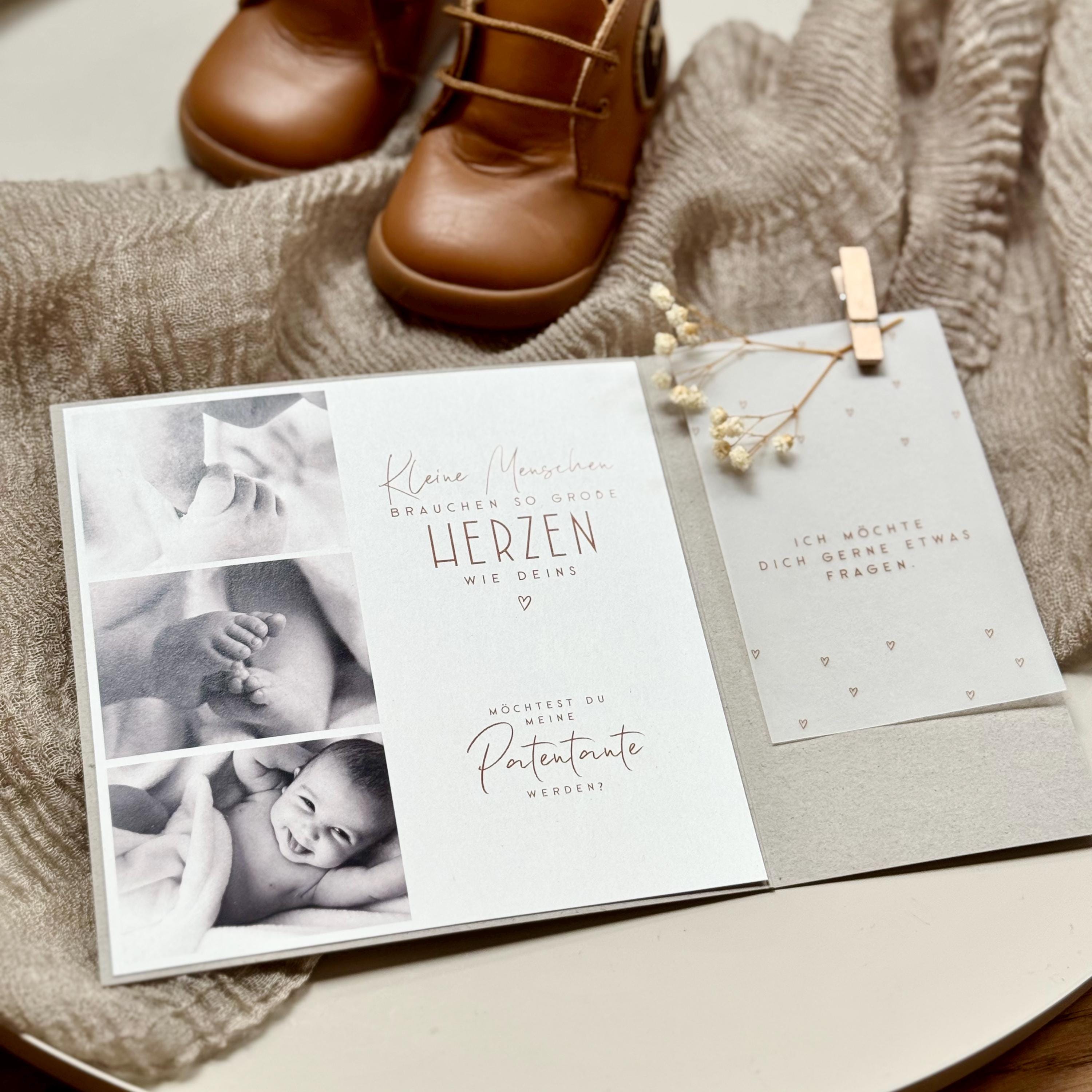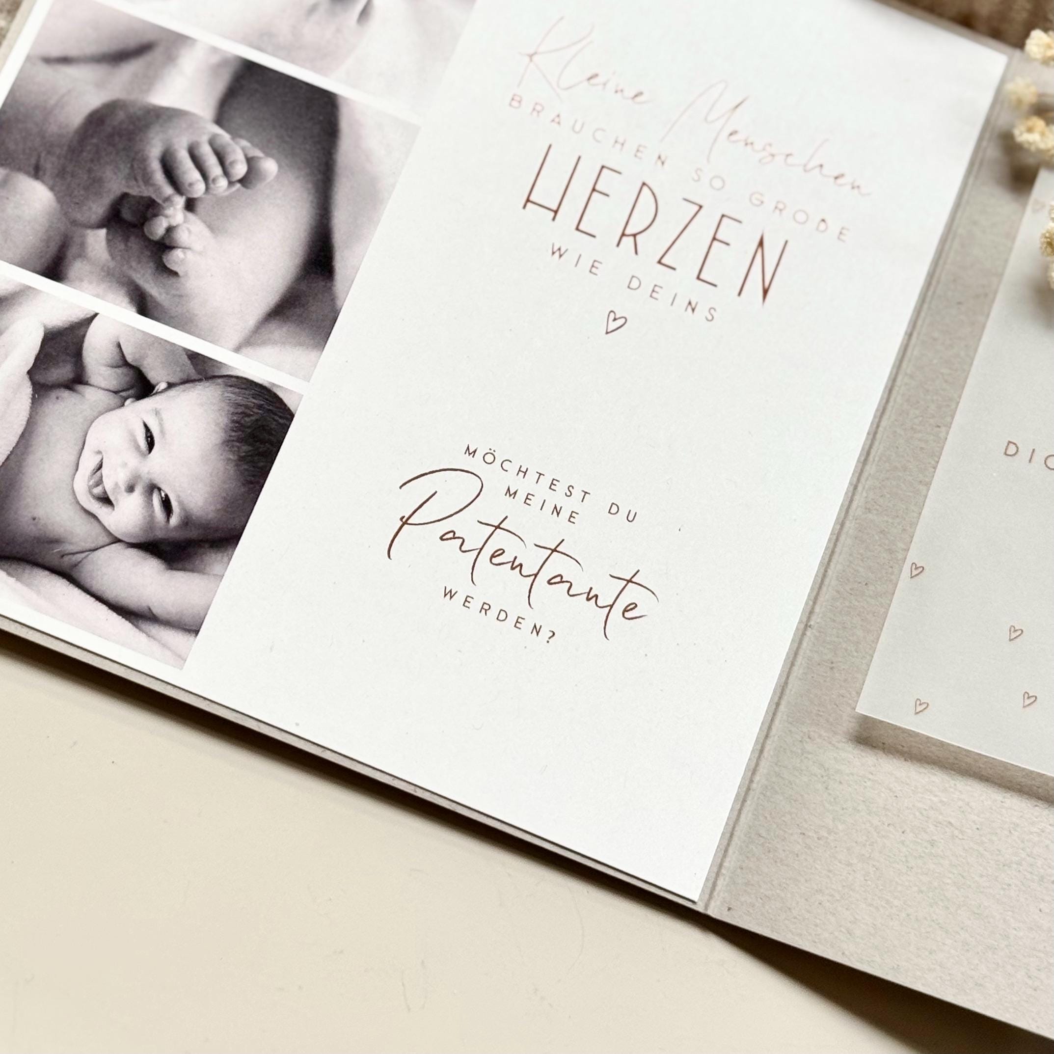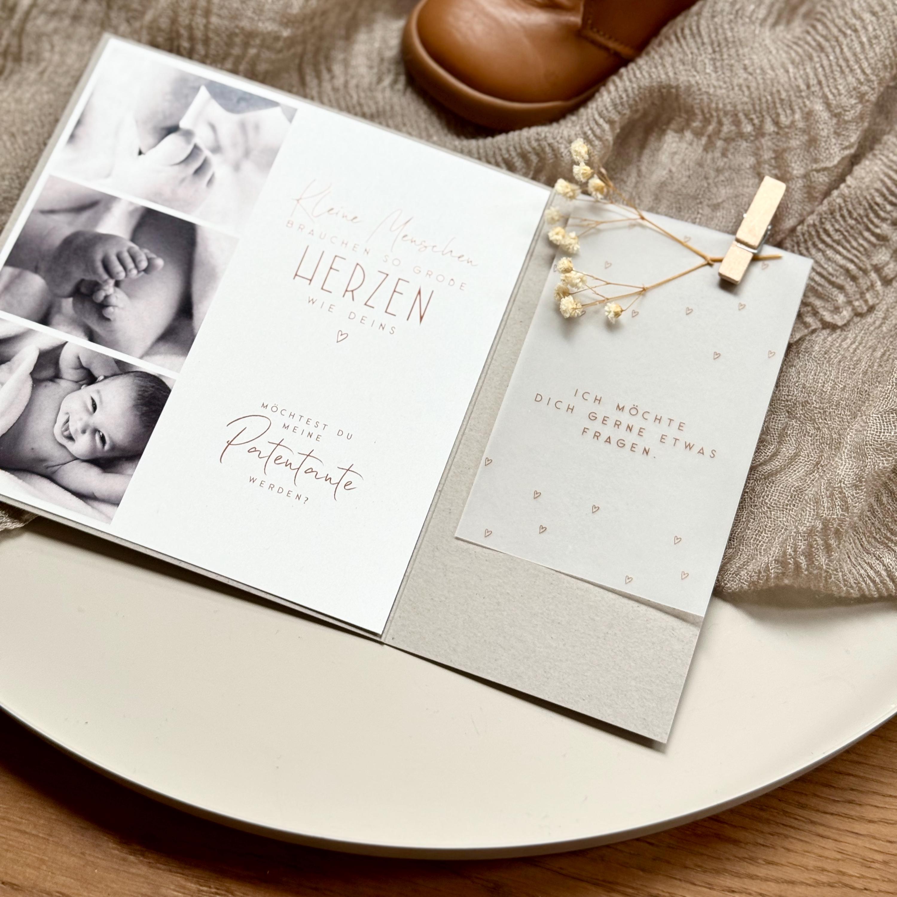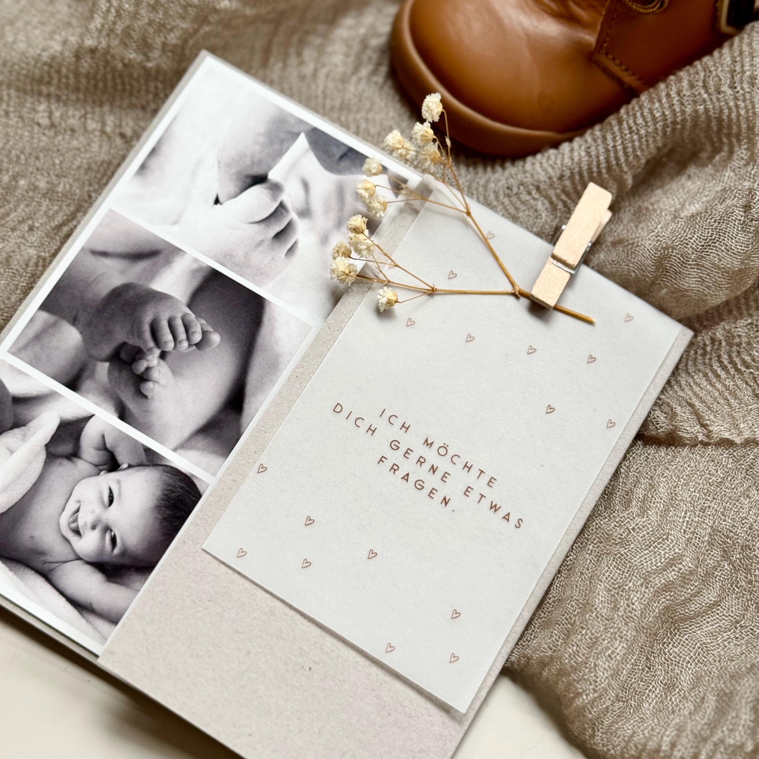 The surprise card is handmade by us – it's a folded card made from very high-quality, beautifully gray-dyed natural paper (25% of the ingredients are recycled leather) with a weight of 380 g/m², which makes this product special both to the touch and to the eye. There are some inclusions or irregularities in the paper, which give it its natural character.