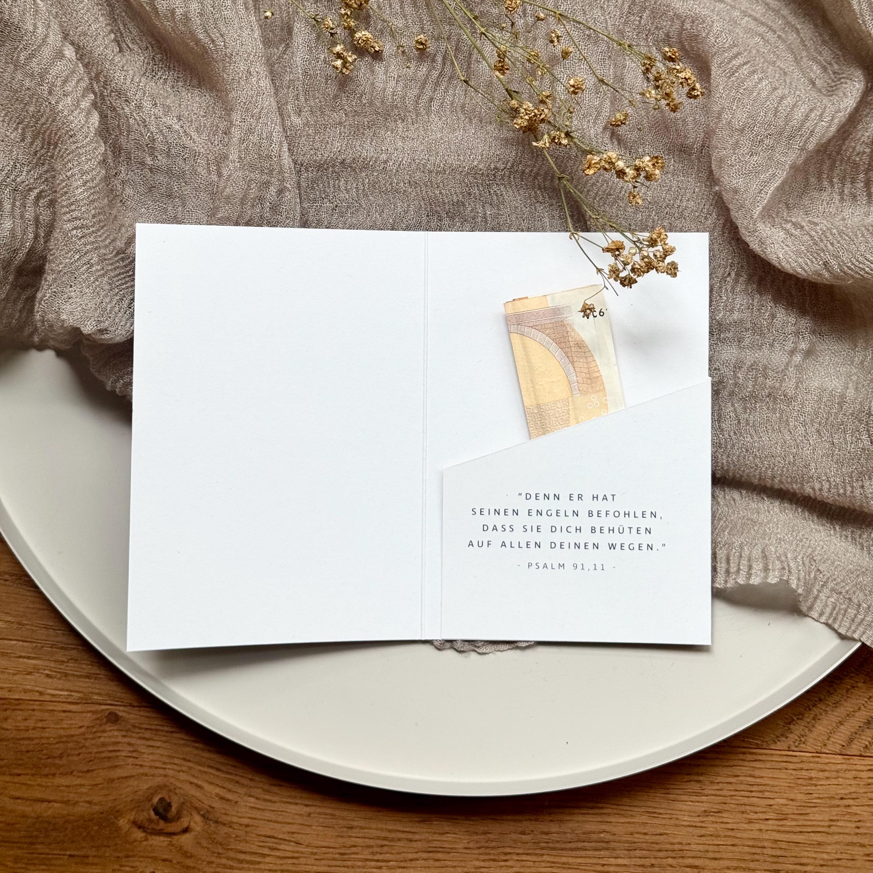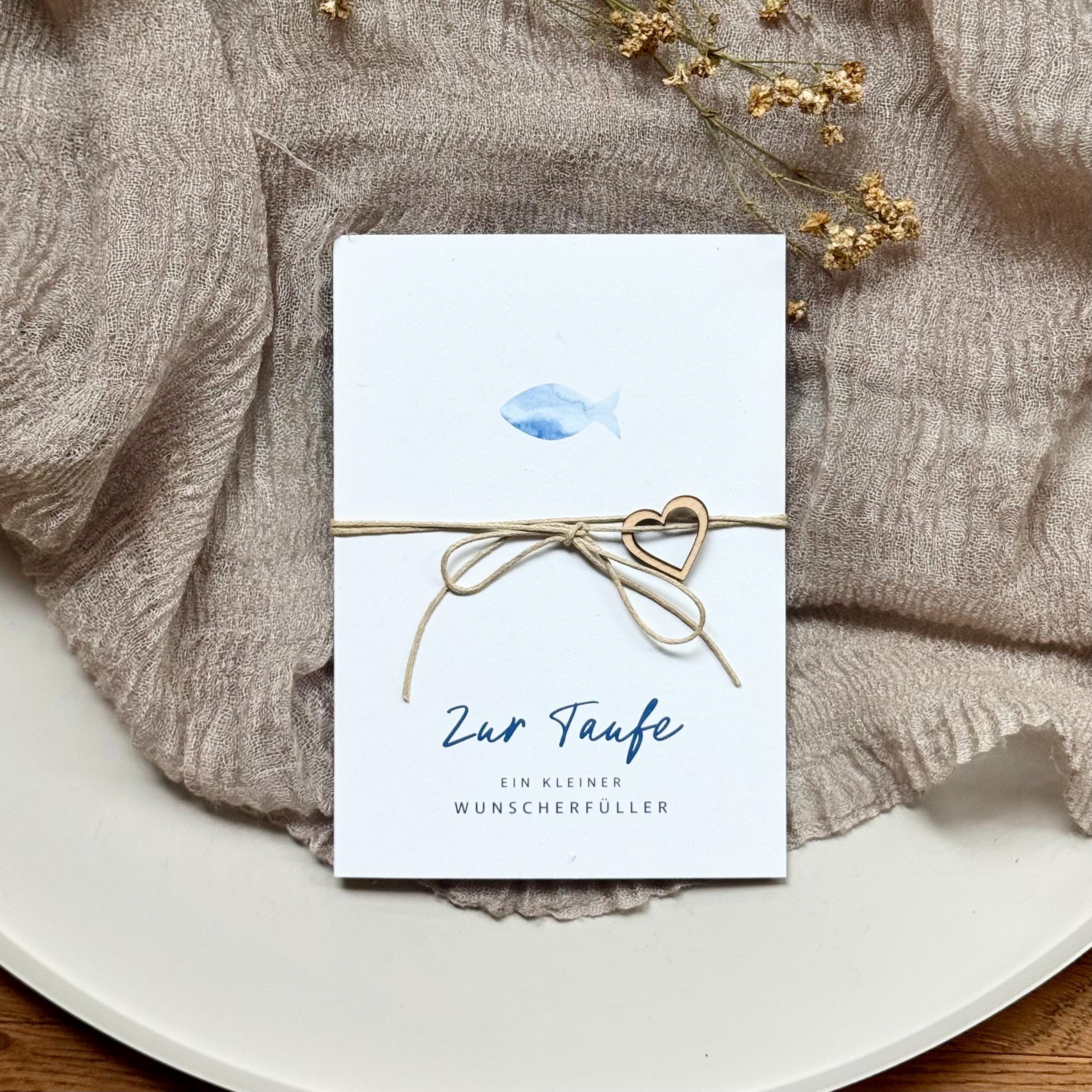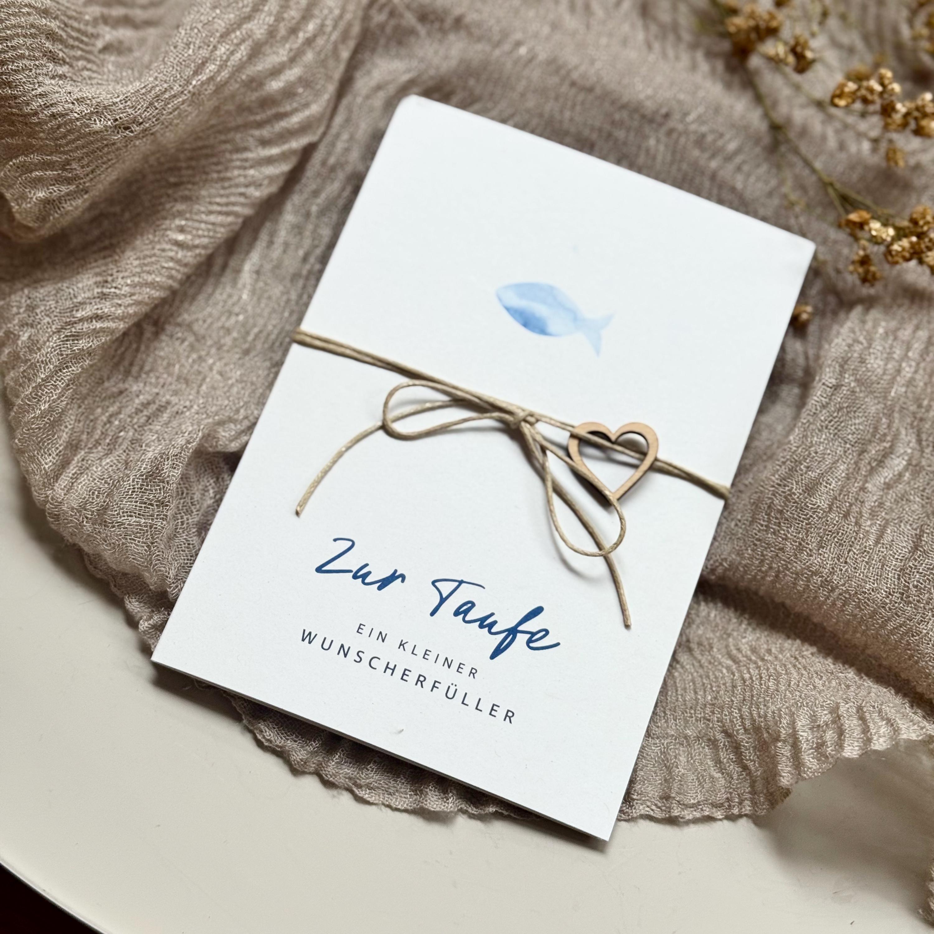 The folder is printed on 300g recycled paper (greyish, not bright white paper) using professional digital printing and is then hand-cut, folded, glued, and finished with a cotton ribbon and a wooden heart.