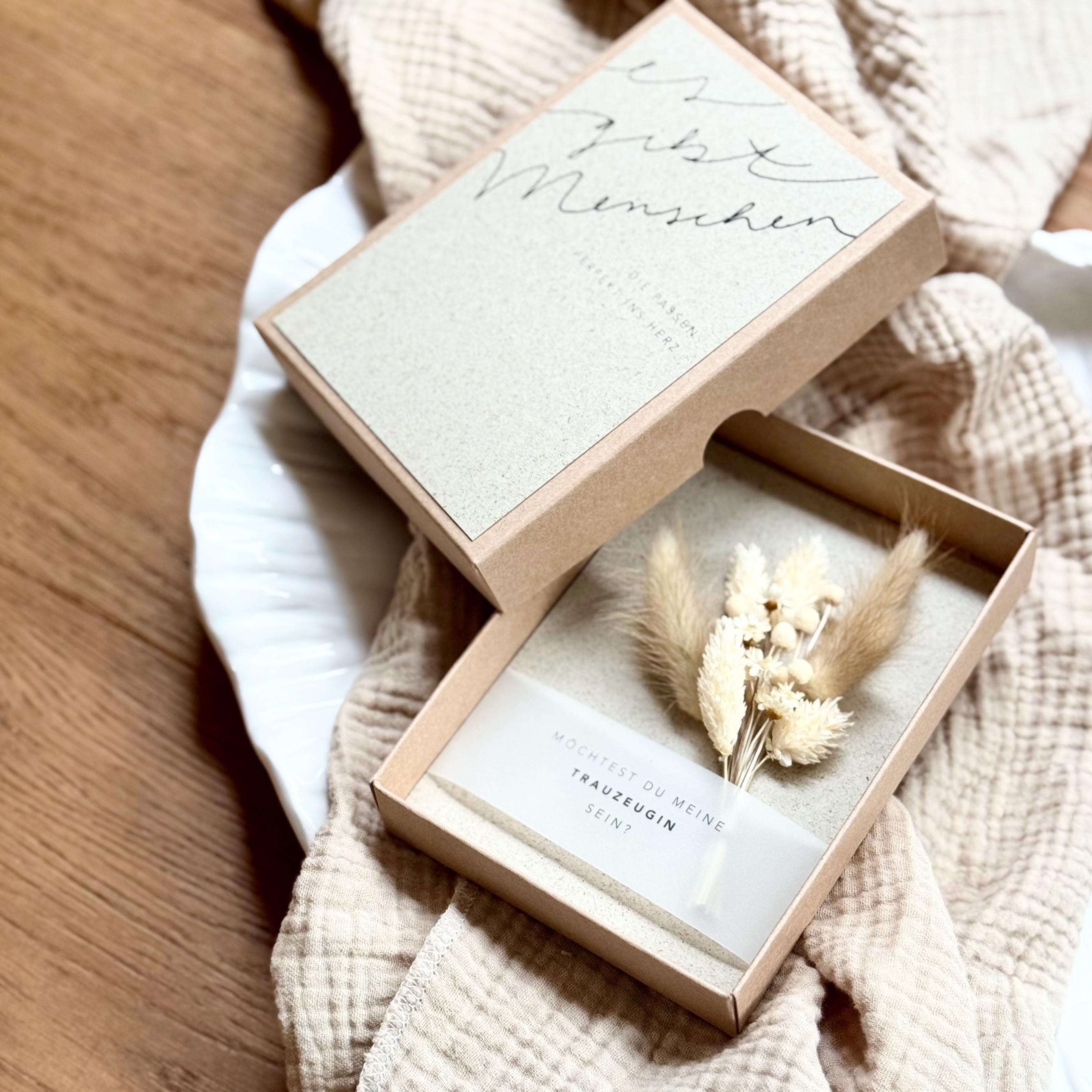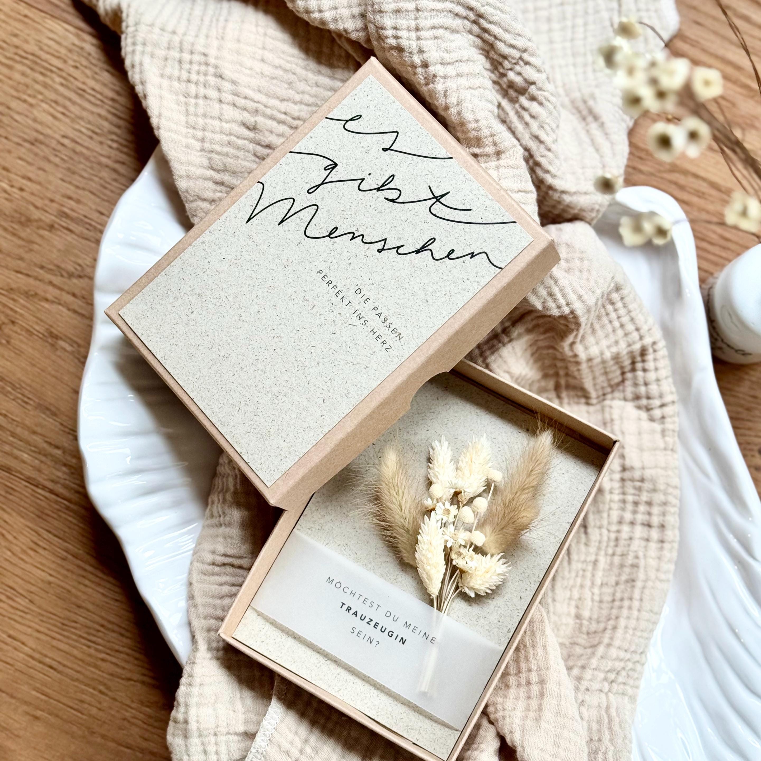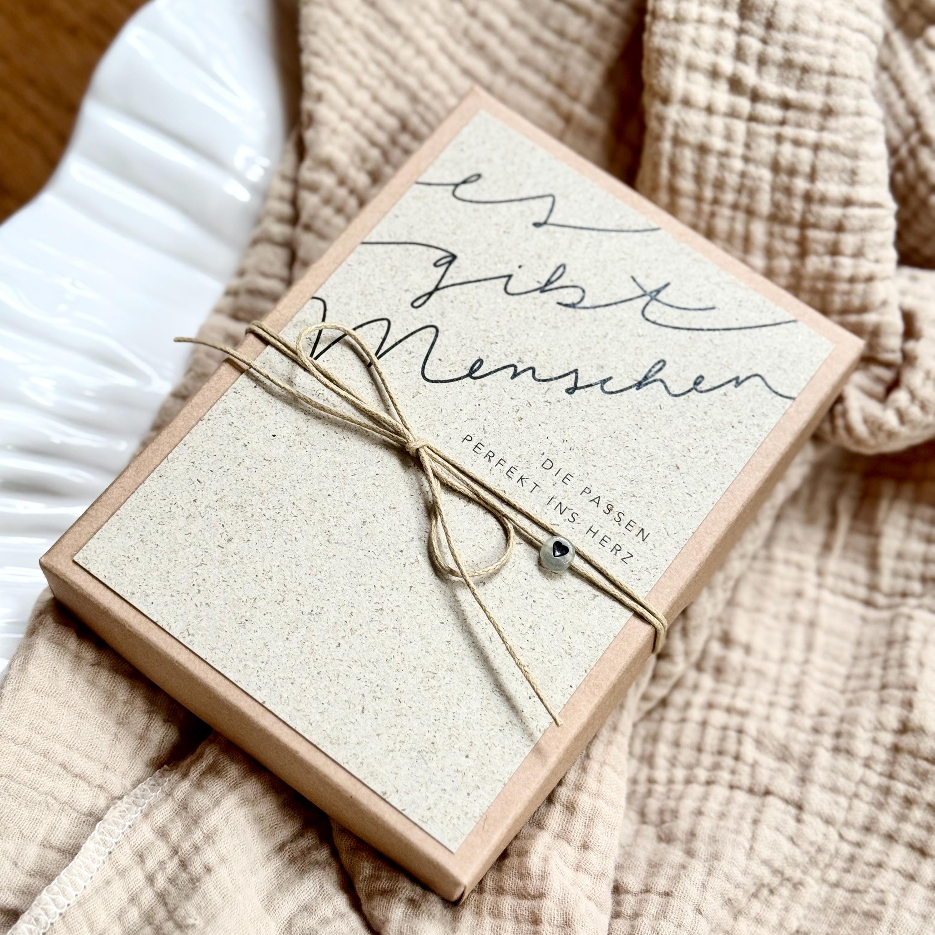 The lid of the small gift box is covered on the outside with a card made of grass paper, on which the saying 'There are people who fit directly into the heart' is written.