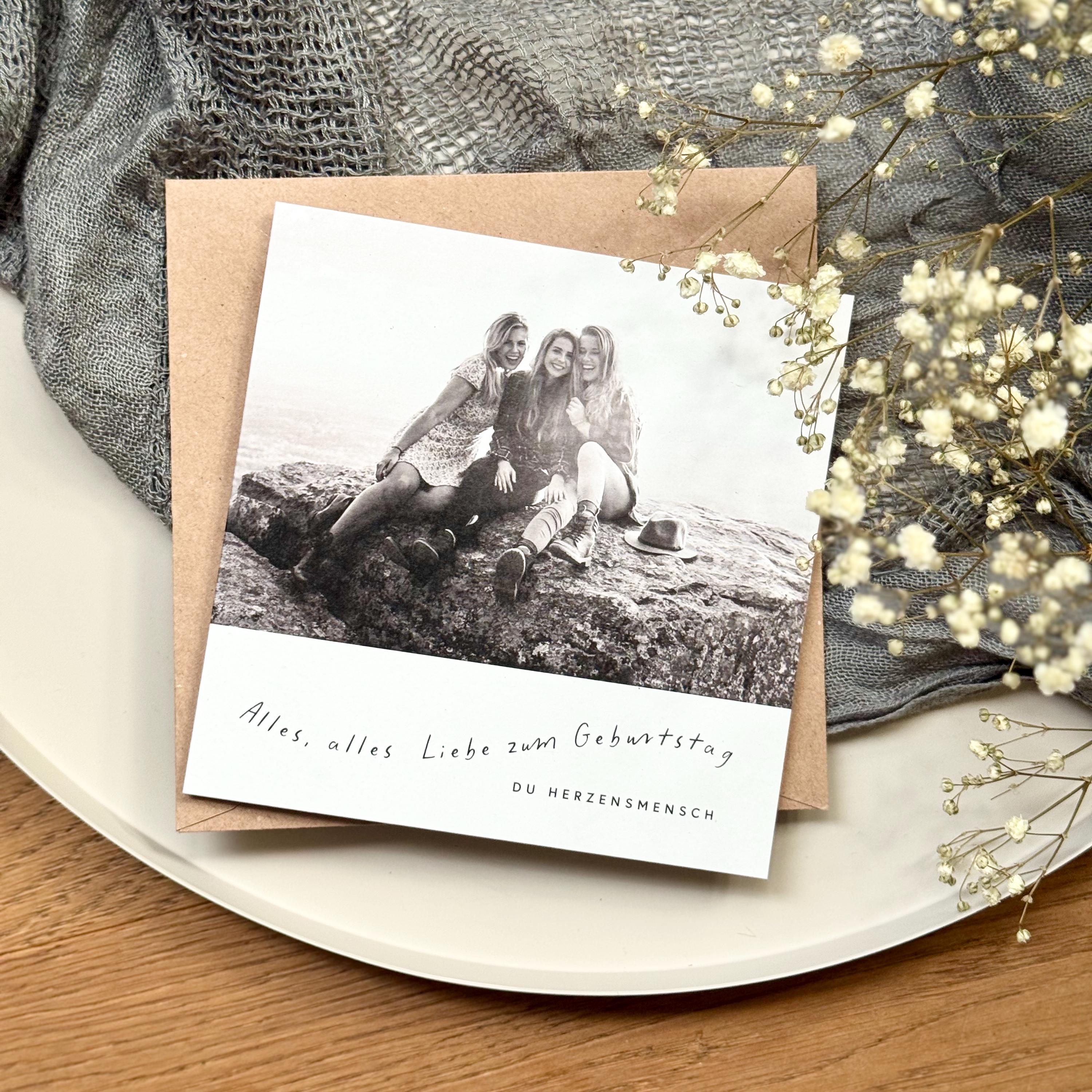 You will receive a personalized folding card in 140 x 140 mm format with a matching kraft paper envelope.