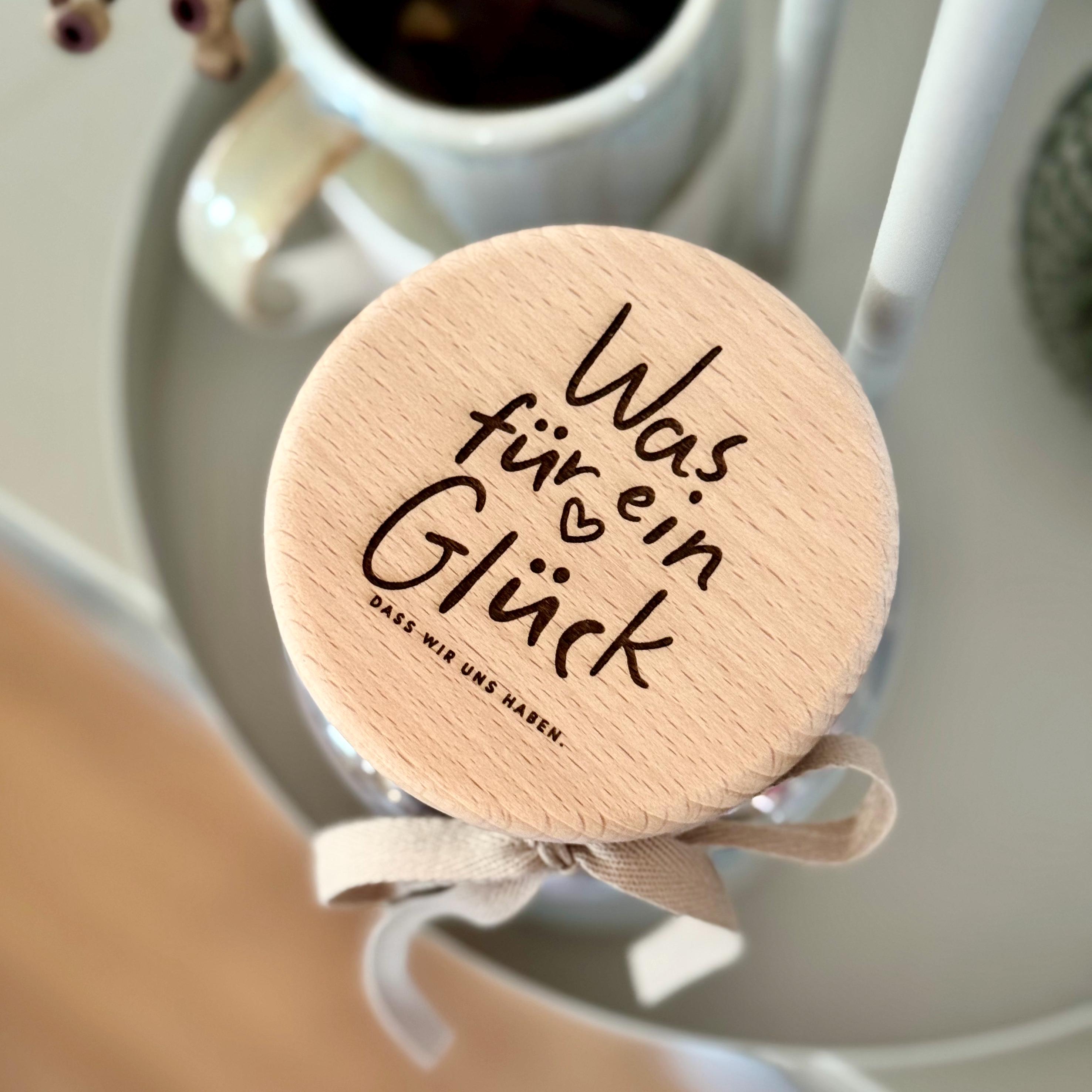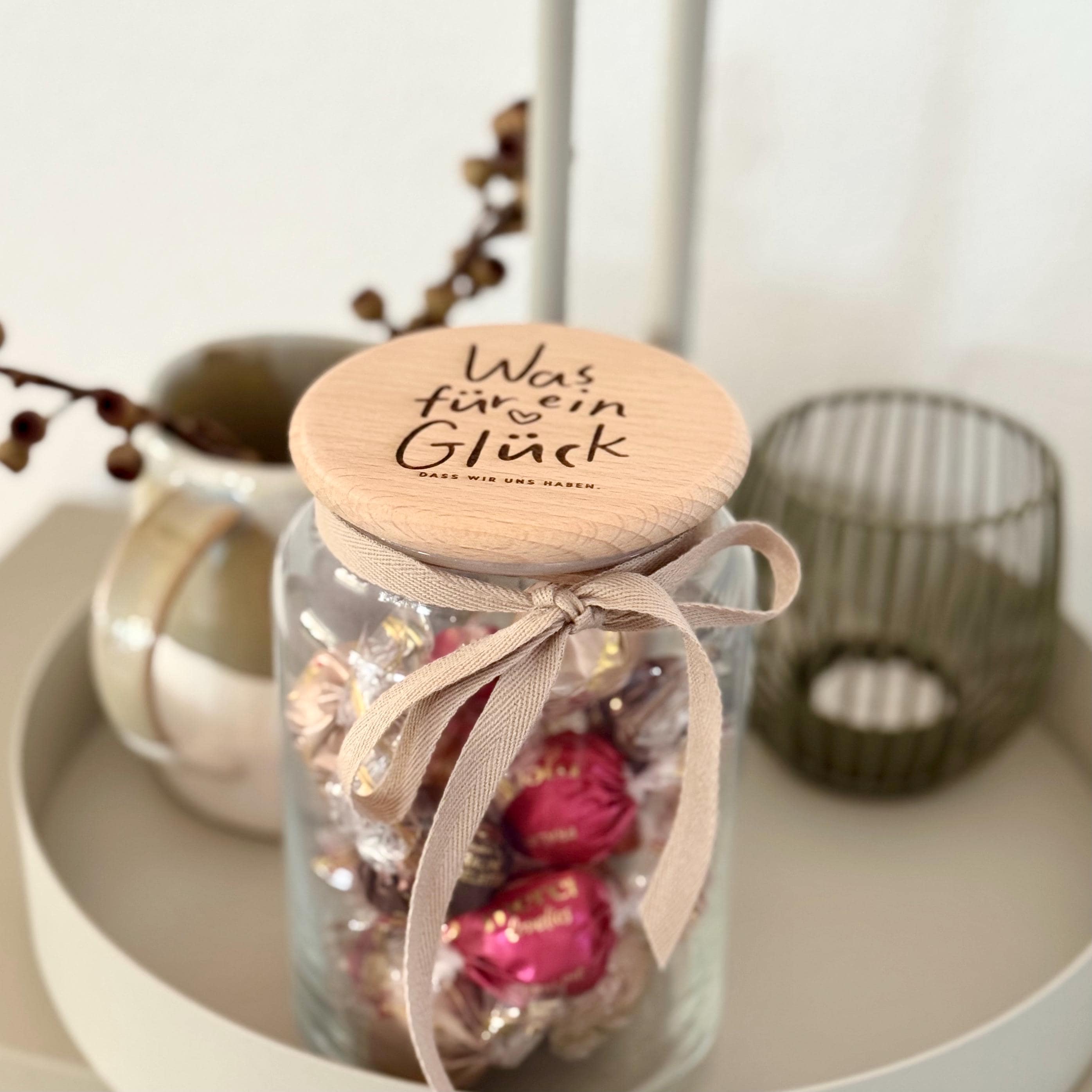Storage jar with beechwood lid | Height 15 cm, jar diameter 10 cm, lid diameter 8.6 cm | Capacity 880 ml | Cotton band