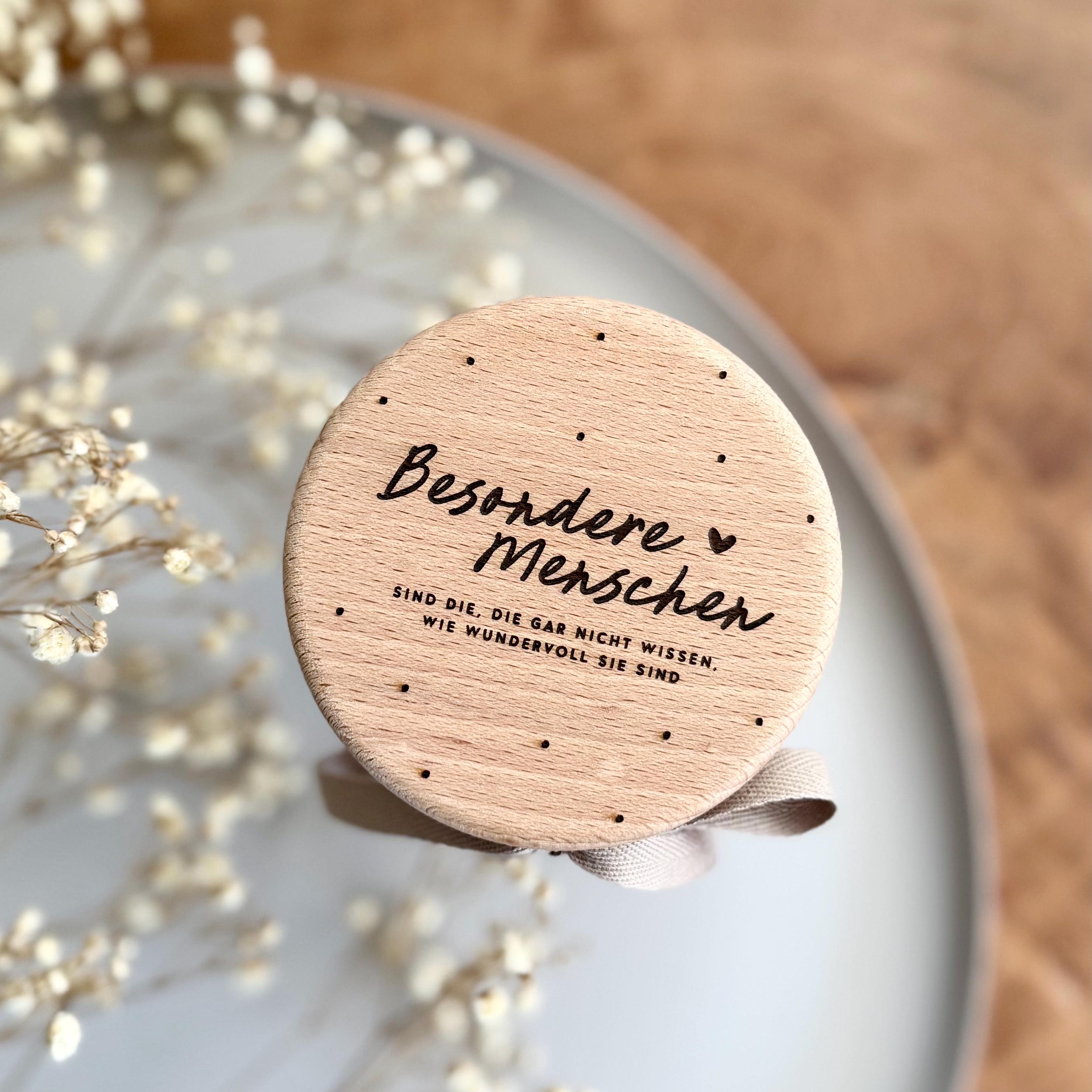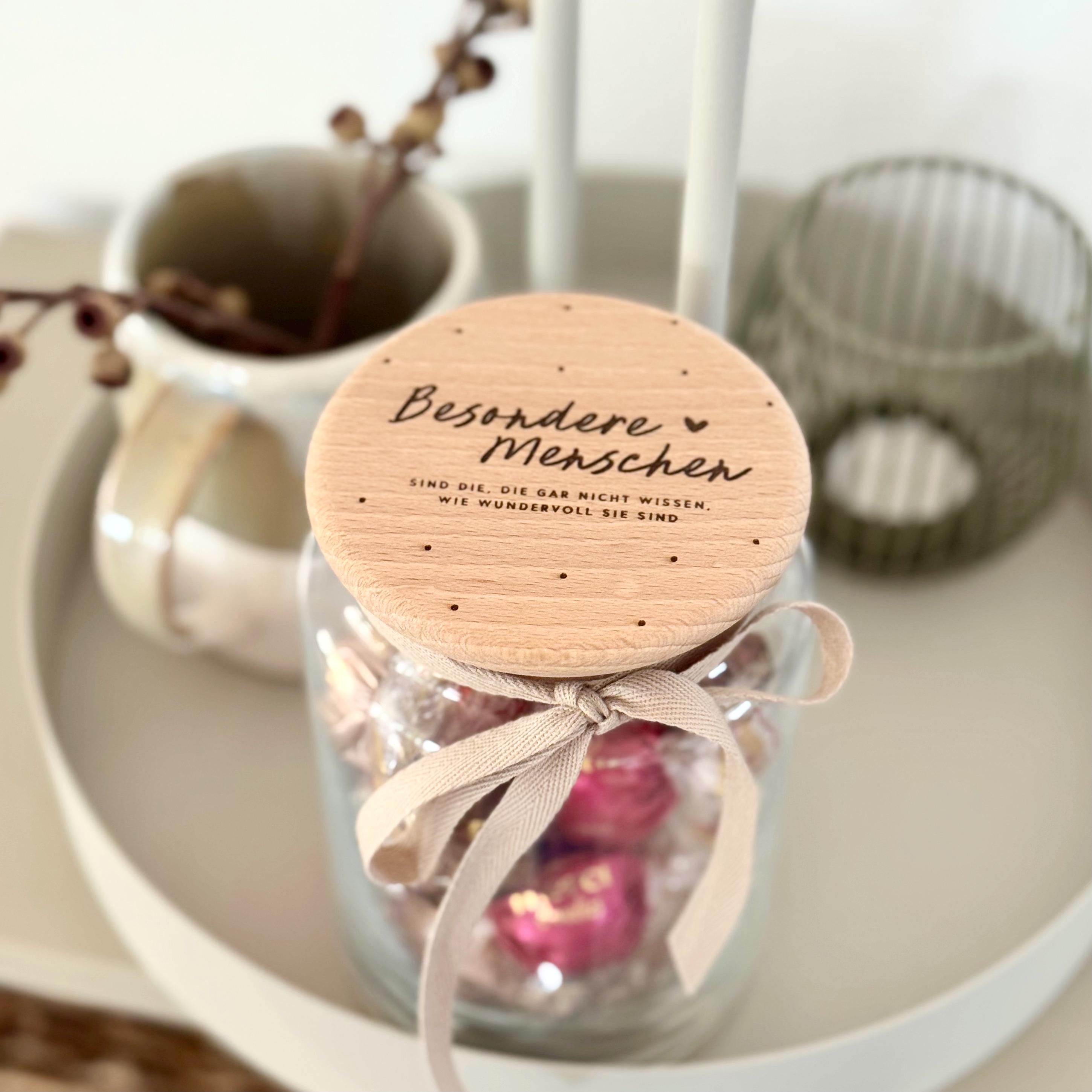 Storage jar with beechwood lid | Height 15 cm, jar diameter 10 cm, lid diameter 8.6 cm | Capacity 880 ml | Cotton band